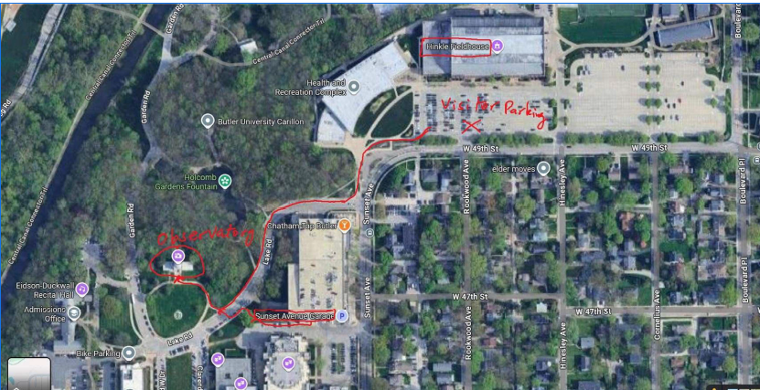 If a bus is your transportation, have the driver drop off and pick up students and at least one chaperone on the west side of the Observatory, Garden Road where the road is marked, and a ramp is located before parking at Hinkle Fieldhouse’s Overflow area.